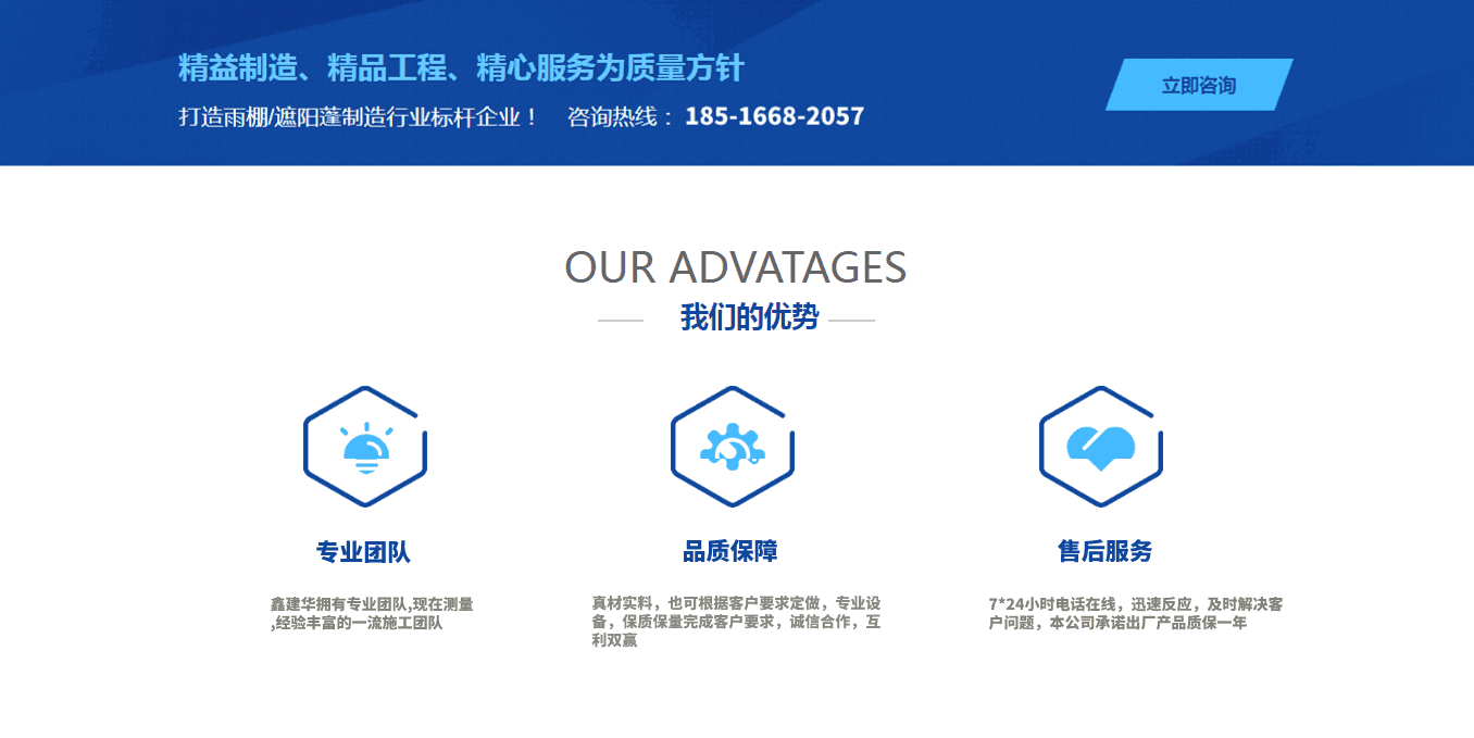 About us鑫建華雨棚有限公司成立于2012年,公司全體勵(lì)精圖治,飛速發(fā)展,已從初創(chuàng)業(yè)公司發(fā)展成為多元化公司,目前公司員工約1000余人,其中擁有中、高級(jí)專(zhuān)業(yè)技術(shù)人員100余人,形成以戶(hù)外制造產(chǎn)業(yè)為主,其他第三產(chǎn)業(yè)為輔的多元式經(jīng)營(yíng)模式,旗下設(shè)有鋼結(jié)構(gòu)公司,環(huán)保設(shè)備公司.其鋼結(jié)構(gòu)公司主要以研發(fā),設(shè)計(jì)、生產(chǎn)、營(yíng)銷(xiāo)、安裝、服務(wù)為一體的鋼結(jié)構(gòu)生產(chǎn)制造型企業(yè),環(huán)保設(shè)備公司主要以“綠色環(huán)保節(jié)能“為核心戰(zhàn)略品牌.公司相關(guān)資質(zhì)齊備,主營(yíng)業(yè)務(wù):定制各種推拉蓬、活動(dòng)雨棚、倉(cāng)庫(kù)雨棚、智能電動(dòng)蓬、伸縮電動(dòng)噴漆房、懸空電動(dòng)雨棚等手動(dòng),遙控電動(dòng)一體,系列產(chǎn)品,公司總部位于中國(guó).江蘇,目前,公司年經(jīng)營(yíng)規(guī)模達(dá)8千萬(wàn)以上,經(jīng)營(yíng)區(qū)減已輻射全國(guó)大部份省會(huì)城市,在雨棚領(lǐng)域展露崢嶸,“鑫建華品牌“已成為國(guó)內(nèi)雨棚,在全國(guó)市場(chǎng)的占有率及品牌均名列前茅. 公司在蘇州、天津、重慶、武漢、濟(jì)南、鄭州、江門(mén)、衡陽(yáng)均設(shè)有工廠(chǎng),覆蓋全國(guó)主要城市、八倉(cāng)生產(chǎn)制作安裝售后、國(guó)內(nèi)訂單全國(guó)范圍可上門(mén)安裝服務(wù)、國(guó)外訂單可派工程師出國(guó)指導(dǎo)安裝....